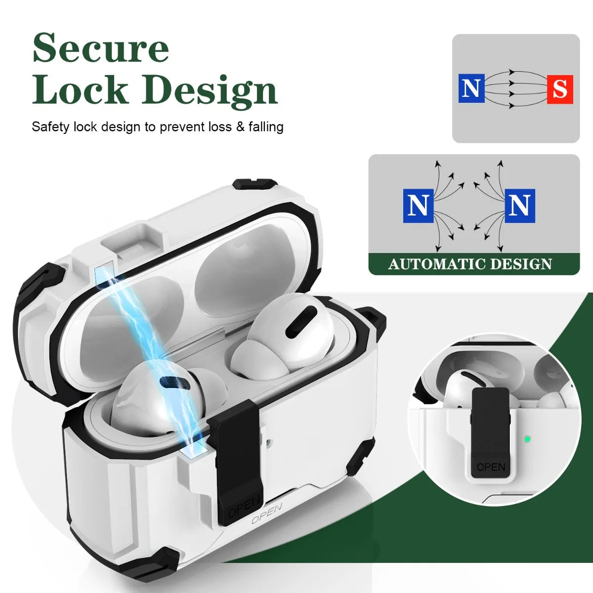 Protect your premium earbuds like never before with this fully fortified, stylish case tailor‑made for the AirPods Pro 3 (2025) model. Engineered from rugged TPU + PC materials, the cover features a built‑in security lock mechanism that prevents accidental openings or drops when you’re on the move. The integrated flip‑lid lock snaps securely, keeping your AirPods safe in transit or everyday use. A built‑in phone‑stand mode allows you to prop up your smartphone for hands‑free viewing right from the earbud case—ideal for video chats or streaming. The case also supports wireless MagSafe charging so convenience isn’t sacrificed for security. With a keychain loop and shock‑absorbent air‑bag corners, it combines high protection with smart portability. Compatible only with AirPods Pro 3 (2025 edition); earbuds and charger not included. (Amazon)
