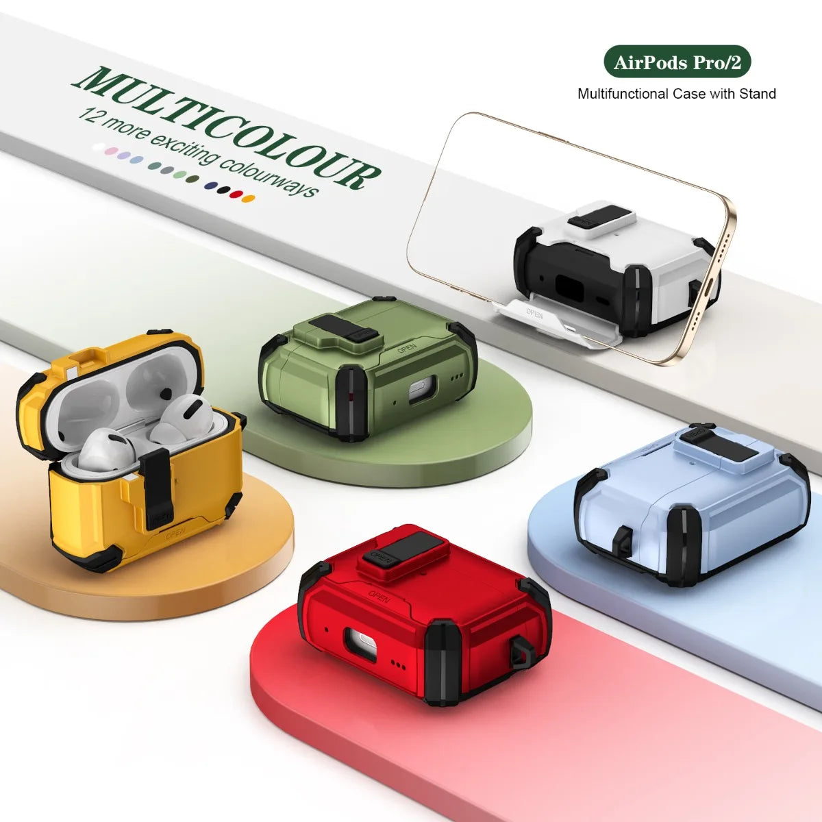 🧷 Key Features 🎯 Precision Compatibility – Designed exclusively for AirPods Pro 3 (2025) generation for perfect fit and function. 🔒 Secure Lock Mechanism – Hidden latch locks the lid firmly, preventing accidental drops or openings. 📱 Built‑In Phone Stand – Flip‑out phone‑stand feature lets you watch videos hands‑free anytime. 🛡️ Rugged Dual‑Material Build – TPU + PC shell with air‑bag corners for shock‑absorption and drop protection. 🔋 MagSafe & Wireless Charging Friendly – Enables wireless charging while the case stays on, no removal needed. 🧼 Bonus Cleaning Kit & Key‑Ring – Comes packaged with cleaning tools and key‑ring for safe mobility. 🔑 Key‑Chain Loop Attachment – Easy to attach to bags, belts, or straps for extra security on the go. 🎨 Stylish Colour Options – Available in multiple colours so you can match your gear and lifestyle.